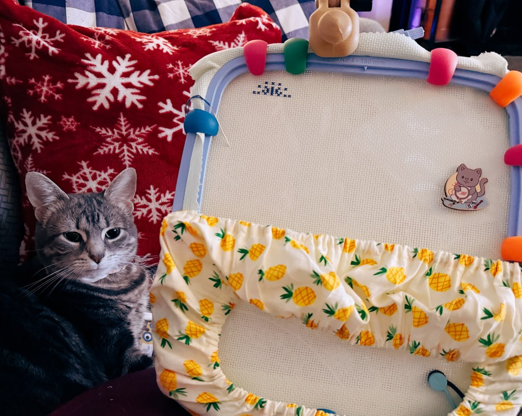 This year, we’ve officially left the cats behind. Well, the cross stitched ones, anyway. Muffin still insists on being involved, or at the very least adjacent to, all of my projects. She may not be the focus of this one, but she is absolutely part of the process.