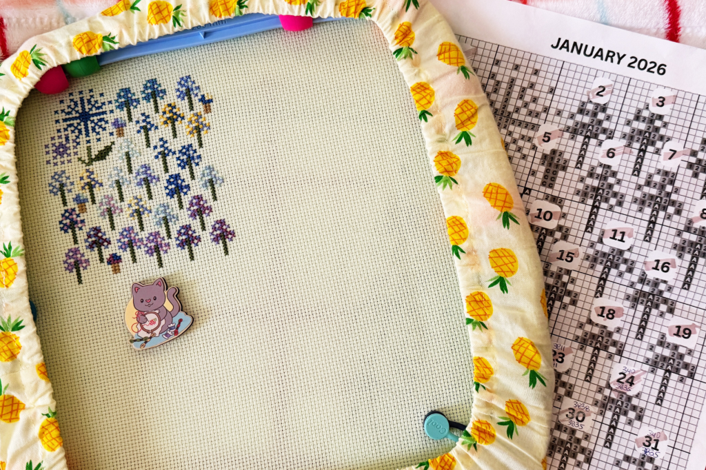 For 2026, I’m stitching a cozy garden — complete with a charming cottage and a few adorable critters — with tiny patches of flowers and plants that change with the months. Each day adds to the landscape. Each temperature shifts the colors. By December, the whole little world should feel alive.